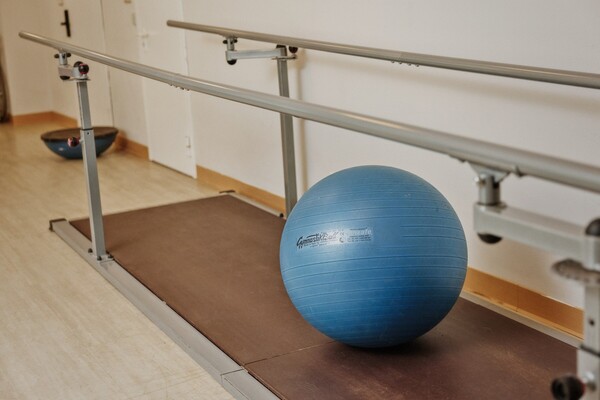 - Пациент встаёт у опоры у параллельных брусьев и учится переносить вес со здоровой ноги на паретичную;