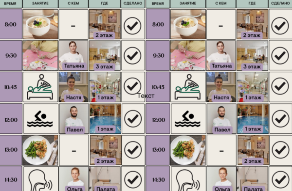 Для людей с нарушением речи можно использовать визуальное расписание. В нём может быть колонка для проставления отметок к выполненным действиям: так пациенту проще заменить свой прогресс.
