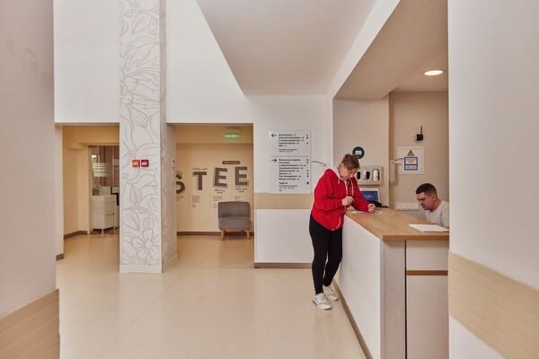 Посмотрите на реабилитационные зоны и пространства для занятий. Помимо зала физической терапии с параллельными брусьями, вертикализаторами, кушетками и зонами для отработки баланса в клинике должна быть территория для отработки повседневных навыков: соблюдения гигиены, приготовления еды, подъёма по лестнице.