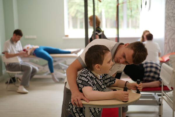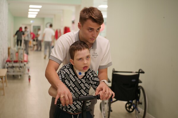 Никита приходит ко мне на занятия с ходунками. В свои 8 лет он перенёс 3 операции на головном мозге. Когда Никита поступил в клинику, он не мог самостоятельно садиться, вставать и ходить. Мы учимся стоять на четвереньках и ползать, чтобы он лучше контролировал свои движения.