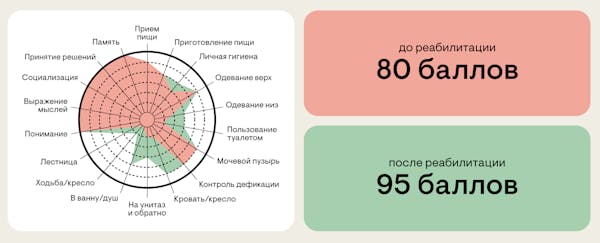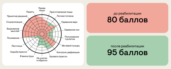 Шкала FIM помогает определить, какие трудности у пациента возникли после инсульта, а затем спрогнозировать потенциал восстановления. Чем выше баллы, тем более независим пациент в повседневной жизни. Нередко количество набранных баллов по шкале FIM коррелирует и с уровнем самостоятельности пациента после реабилитации.