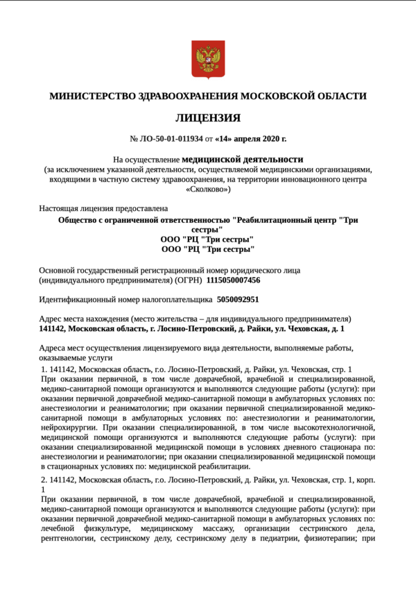 Основной государственный регистрационный номер юридического лица (индивидуального предпринимателя) (ОГРН) 1115050007456 Идентификационный номер налогоплательщика 5050092951 Адрес места нахождения (место жительства – для индивидуального предпринимателя) 141142, Московская область, г. Лосино-Петровский, д. Райки, ул. Чеховская, д. 1 Адреса мест осуществления лицензируемого вида деятельности, выполняемые работы, оказываемые услуги 1. 141142, Московская область, г.о. Лосино-Петровский, д. Райки, ул. Чеховская, стр. 1 При оказании первичной, в том числе доврачебной, врачебной и специализированной, медико-санитарной помощи организуются и выполняются следующие работы (услуги): при оказании первичной доврачебной медико-санитарной помощи в амбулаторных условиях по: анестезиологии и реаниматологии; при оказании первичной специализированной медикосанитарной помощи в амбулаторных условиях по: анестезиологии и реаниматологии, нейрохирургии.