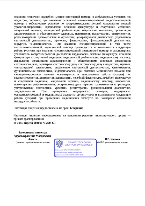 При оказании медицинской помощи при санаторно-курортном лечении организуются и выполняются работы (услуги) по: гастроэнтерологии, диетологии, кардиологии, лечебной физкультуре, лечебной физкультуре и спортивной медицине, мануальной терапии, медицинскому массажу, неврологии, психотерапии, рефлексотерапии, сестринскому делу, терапии, травматологии и ортопедии, ультразвуковой диагностике, урологии, физиотерапии, функциональной диагностике, эндокринологии. При проведении медицинских осмотров, медицинских освидетельствований и медицинских экспертиз организуются и выполняются следующие работы (услуги): при проведении медицинских экспертиз по: экспертизе временной нетрудоспособности. Настоящая лицензия предоставлена на срок: бессрочно Настоящая лицензия переоформлена на основании решения лицензирующего органа — приказа (распоряжения) от «14» апреля 2020 г. № 290-УЛ