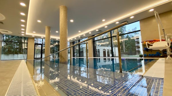 В 2022 году у нас заработал новый бассейн глубиной 135 сантиметров. Занятия в воде очень важны для восстановления двигательной активности и входят в реабилитационную программу у многих пациентов. Бассейн оборудован удобным пандусом, перилами, электрическим подъёмником и коляской.